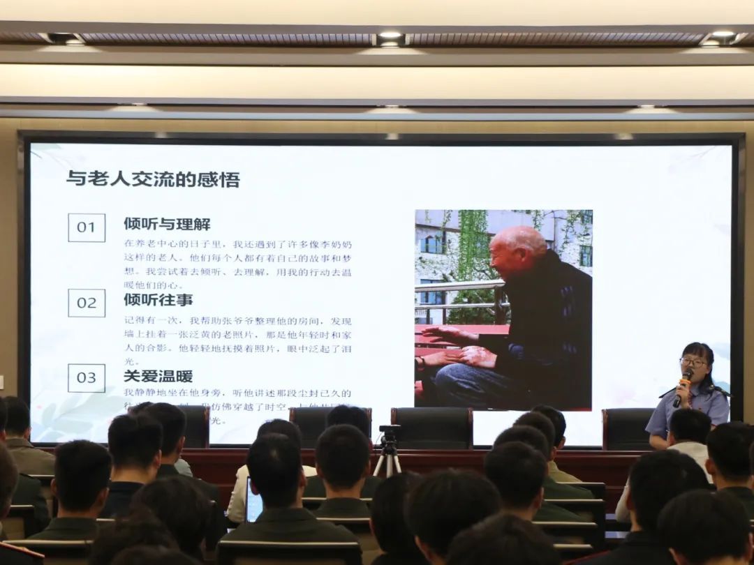 学院2024年暑期大学生社会实践活动先进个人表代表、学院暑期社会实践分享交流报告会二等奖获得者刘雨昕以《爱,在夕阳下绽放——我的养老中心志愿服务之旅》为主题,讲述着她在养老中心的难忘经历,她说道:“这次养老中心的志愿服务之旅,让我明白了关爱老人不仅仅是一种责任,更是一种传承。”