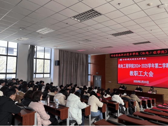2月23日,机电工程学院在阶梯教室召开2024-2025学年第二学期新学期教职工大会,旨在收心聚力,全面部署新学期各项工作。会议由学院副院长郭峰主持,全体教职工参会。