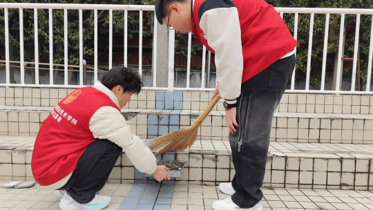 随后,团总支干部带领各班志愿者迅速开始了一场意义非凡的校园清扫活动,同学们有条不紊地开展清扫工作。在教学楼前,同学们手持扫帚、簸箕,认真清扫着每一处角落,不放过任何一片落叶、一张纸屑。一些同学还主动清理墙壁上的小广告,他们用铲子小心地铲除,再用湿布仔细擦拭,使教学楼的墙面焕然一新。