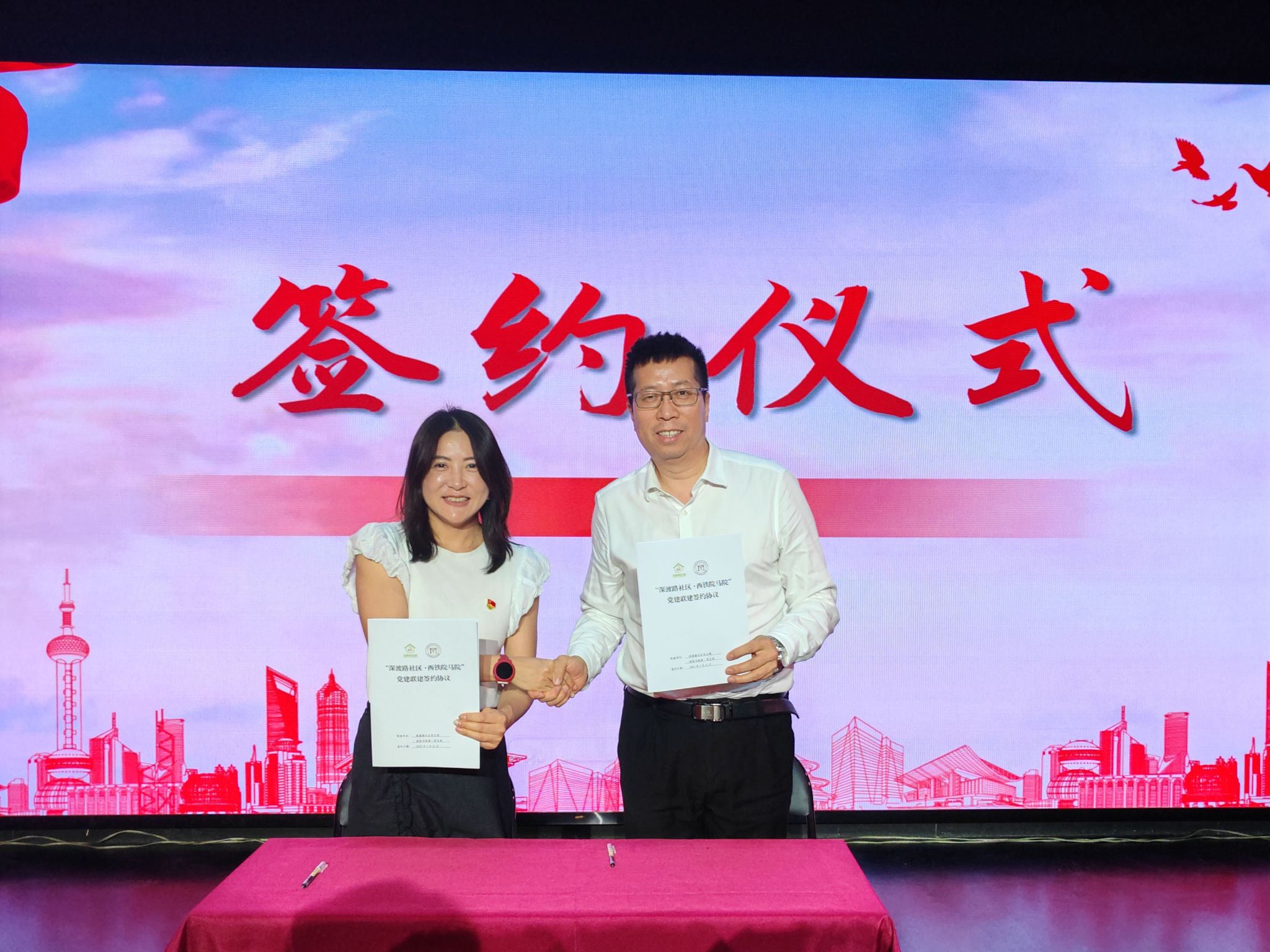 在签约仪式环节,马克思主义学院第一党支部书记邢卫红代表支部与深渡路社区签署了联建共建协议。双方将围绕党建工作重点、社区居民需求以及软硬件资源优势,开展项目化运作模式,丰富社区服务资源清单,共同打造具有示范带动效应的党建联建品牌。随后,新合街道办事处副主任李鹏程、街道领导班子成员张琛和马琳一同上台,为各共建单位授牌并颁发“联建共建单位”牌匾。