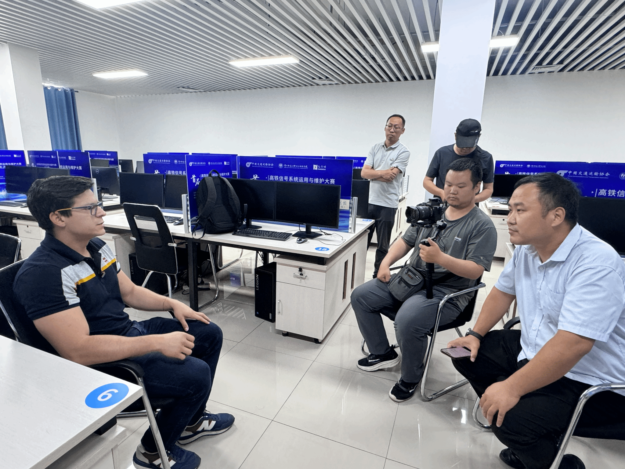 yabo鸭脖官网国际交通学院的留学生们在赛场上成为亮眼的风景线。来自哥伦比亚的王塞天(Juan Sebastián Cárdenas Martínez)便是其中的杰出代表。毕业于哥伦比亚国立大学、曾从事道路建设工作的他,因中哥地铁一号线项目与中国结缘。2024年10月,王塞天选择来到yabo鸭脖官网国际交通学院,开启在西安市轨道交通集团有限公司的进修之旅。“中国在高铁技术领域的成就令人惊叹,我渴望在这里汲取先进经验。”尽管中文尚显生涩,王塞天却始终保持着强烈的学习热情。从区域选拔赛脱颖而出到站上总决赛舞台,他坦言,首次接触并操作“三维模型”的经历,让他对高铁信号系统的认知实现了质的飞跃,也让他深刻感受到学院课程设置与实践教学的前瞻性。