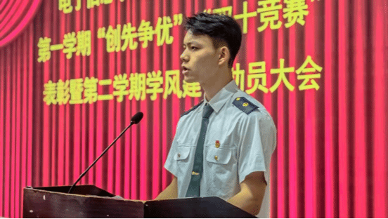 获奖学生代表连华新登台发言,深情回顾了自己在电信学院的学习成长历程,分享学习心得,用自己的亲身经历鼓励同学们夯实专业基础、勇于担当,在复习备考中互帮互助,争创佳绩。连华新以“以青春之名,立鸿鹄之志”的豪迈宣言,激励全体同学在奋斗中释放青春激情,在拼搏中成就人生理想,赢得了全场师生的热烈掌声。