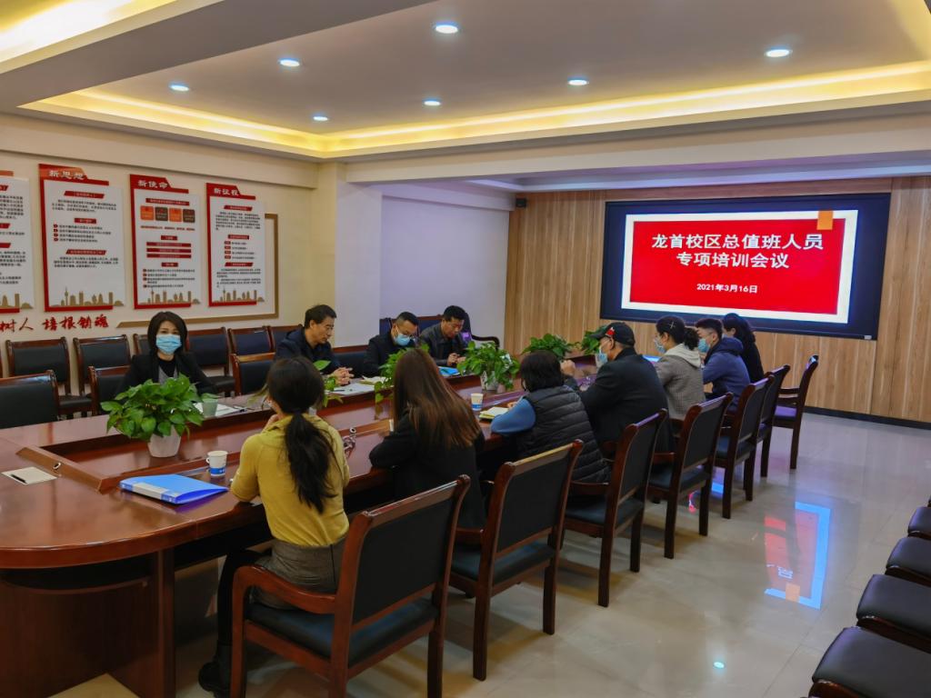 为全面提升校区治理能力,加强疫情防控常态下的稳定安全、服务教育教学、应急管理及节能减排各项工作,3月16日上午,龙首校区召开总值班人员专项培训会议,传达学院关于加强值班工作的相关要求,对如何做好校区总值班工作作了具体、明确的部署和安排。自强综合管理处处长杨稳利做专题培训,龙首校区相关科室负责人就食品卫生防疫、水电气暖巡查及消防安全等重点环节做了补充,校区全体值班人员参加了培训。