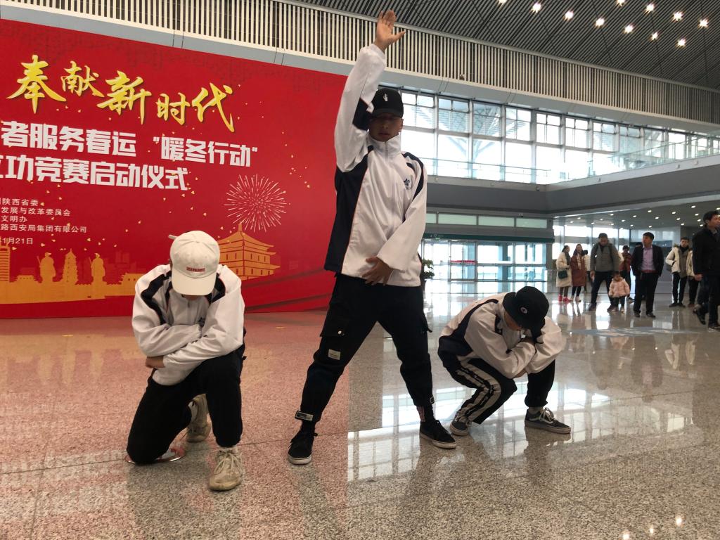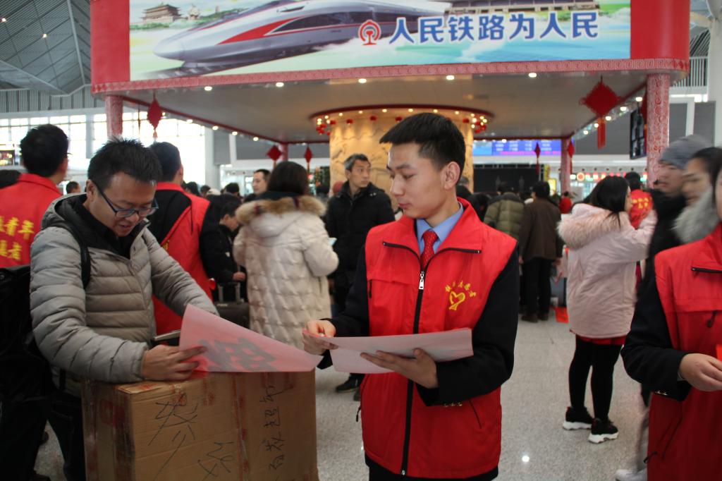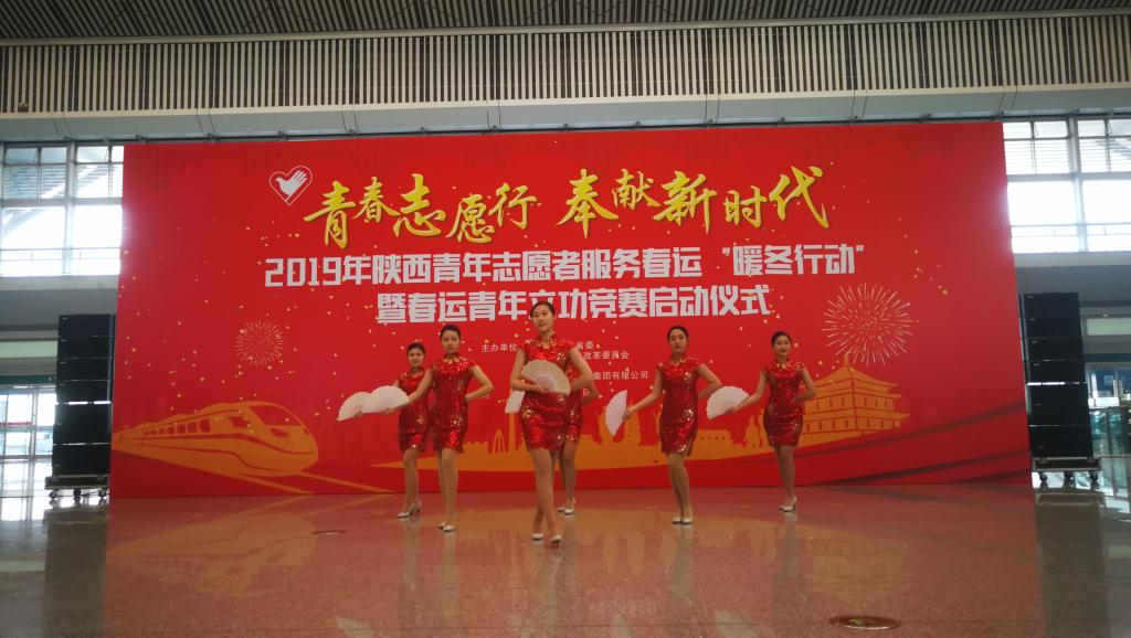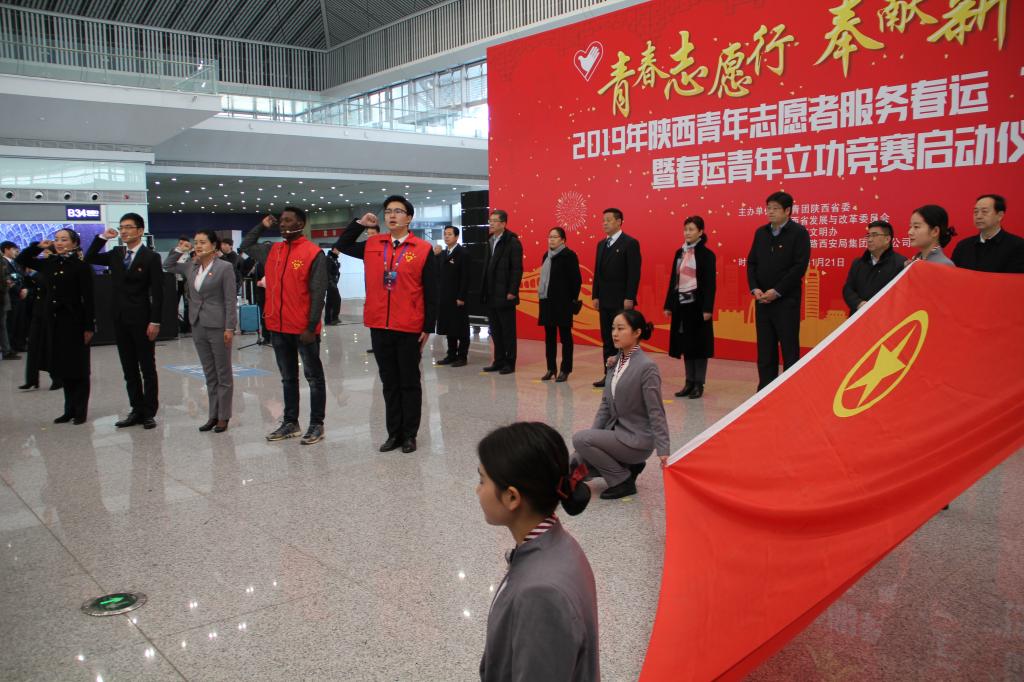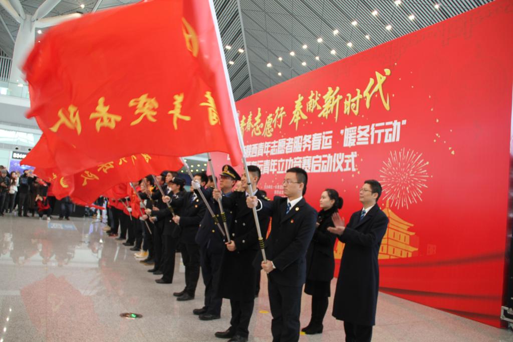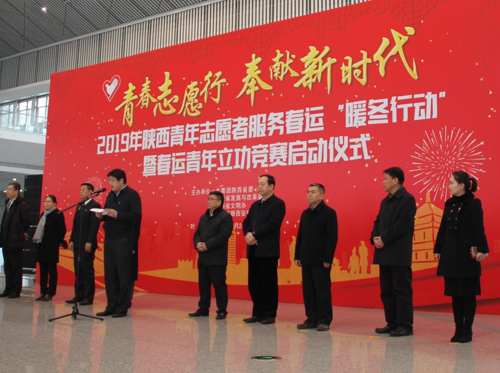 1月21日上午,由共青团陕西省委、省发改委、省文明办、中国铁路西安局集团有限公司等单位共同举办的“2019年陕西青年志愿者服务春运‘暖冬行动’”暨春运青年立功竞赛启动仪式在西安北站二楼候车大厅隆重举行。共青团陕西省委副书记、党组成员鲁镇,中国铁路西安局集团有限公司党委副书记、副董事长杨修昌,鸭脖党委副书记、纪委书记黄家昌,西安地铁有限公司团委书记李铁军等来自高校、地铁、公路、机场等系统的相关领导及300名青年志愿者代表出席了启动仪式。鸭脖团委副书记张治平、团委老师与鸭脖参与此次“暖冬行动”的四支队伍——西安北站服务队、西安站服务队、汉中站服务队和西安地铁服务队的共160余名春运志愿者参加了此次活动。