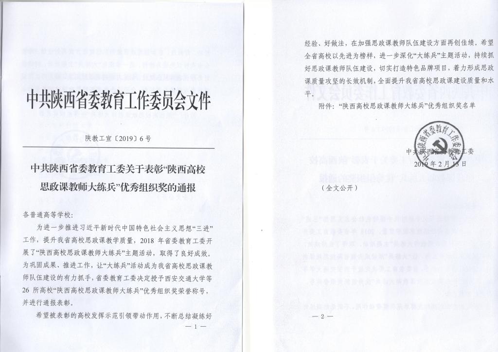 近日,根据中共陕西省委教育工委《关于表彰“陕西高校思政课教师大练兵”优秀组织奖的通报》(陕教[2019]6号),鸭脖被授予“陕西高校思政课教师大练兵”优秀组织奖荣誉称号。