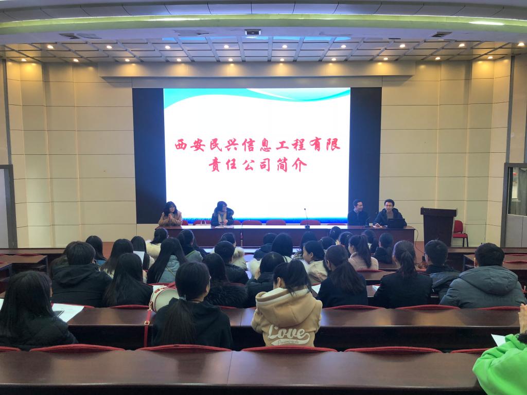 为提高毕业生就业质量,拓宽就业渠道,电子信息学院根据专业特色,于2月28日邀请西安民兴信息工程有限责任公司、北京博雅立方科技有限公司、北京世纪安图数码科技发展有限责任公司西安分公司三家企业进校作招聘宣讲,提供就业岗位,帮助学生就业。