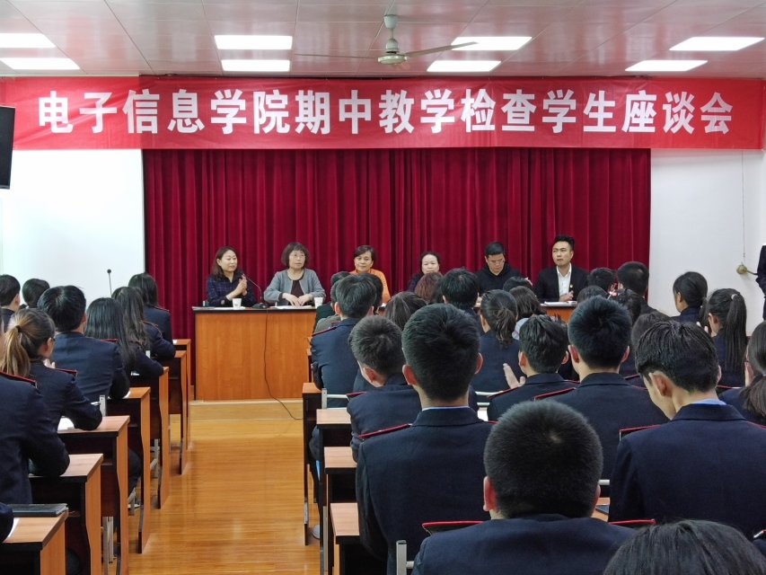 为深入全面了解本学期的教学情况,倾听广大学生的心声,更好地组织教学,电子信息学院10个专业24个班级的学生代表于5月8日下午在鸭脖自强校区教学楼407召开期中教学检查学生座谈会。电子信息学院院长孙津平、党总支书记张伟敏、教务处副处长督导室主任史艺红、督导室吴麦仙教授以及学工办、教研室主任和72名来自各班的学生代表参加了座谈会,会议由电子信息学院办公室主任马荣主持。