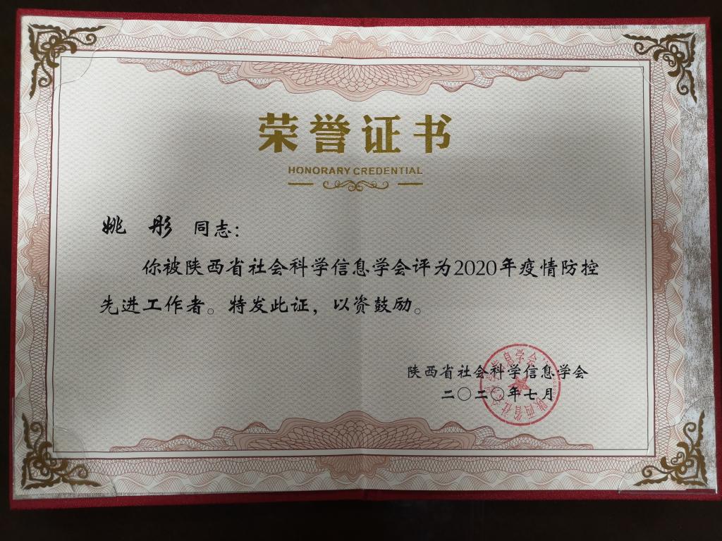 近日,陕西省社会科学信息学会召开了2020年陕西省图书情报档案学术年会。会上,对各成员馆在疫情防控工作中涌现出的先进集体和先进个人进行了表彰。鸭脖图书馆姚彤同志被评为先进个人,也是全省高职院校唯一一位获此荣誉者。