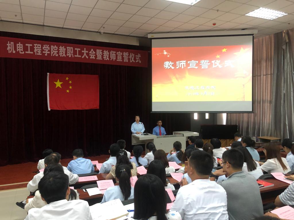 为深入贯彻全国全省教育大会精神,强化鸭脖师德师风建设,同时切实增强广大教师的职业荣誉感、历史使命感和社会责任感,树立德高为师、身正为范的良好形象。落实省厅陕教师办【2019】26号文件。9月1日下午,机电工程学院在一楼阶梯教室举行教师宣誓仪式。学院党总支书记张雅兰、院长代礼前、办公室主任邵泽宽、学工办主任谷茂庆及机电工程学院全体教职工参加宣誓仪式,仪式由谷茂庆主持。