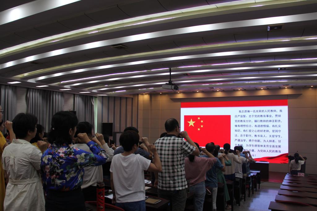 会议开始前,学院隆重举办喜迎第35个教师节全体教师集体宣誓仪式。在雄壮的国歌声后,由全国优秀教师赵岚老师领誓,全体教师举起右手,面对国旗庄严宣誓。通过开展教师宣誓活动,不仅提高了老师们从业的神圣感和使命感,更进一步增强了大家的职业幸福感和荣誉感,提高了教师团队的凝聚力。