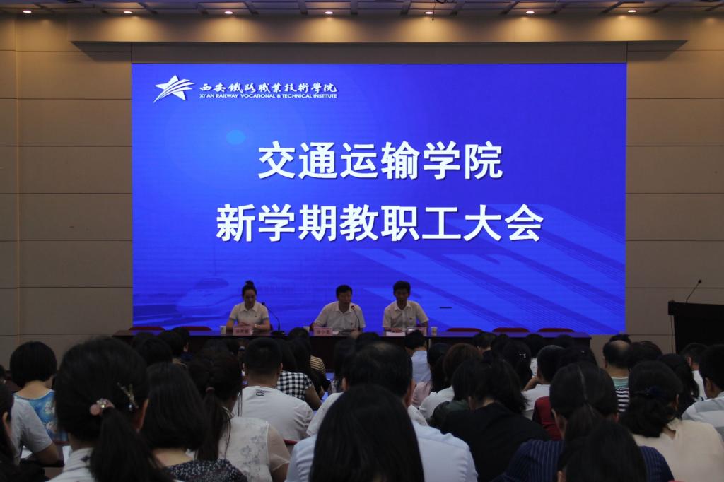 在新学期教职工大会上,院长徐小勇从取得的4项国家级成果(铁道交通运营管理专业获批国家级骨干专业、铁道交通运营管理专业校企合作生产性实训基地获批国家级实训基地、物流管理专业获批国家首批“1+X”证书试点专业、主持编写的铁路物流管理专业国家教学标准通过行指委审定等)、承担学校“双高计划”两个专业群的申报任务、两个专业获批西安市重点扶持专业、国家级学生技能大赛成绩取得重大突破、学校教学比武教师表现优异等方面着手,总结了上半年学院重点工作;同时,以办“当地离不开、业内都认可、国际可交流”的高职专业为目标,从“加强专业内涵建设,打造铁道运营管理专业群为国内一流专业群;举全院之力,提供发展平台,打造高水平的双师型教学团队;针对不同专业特点,建设高水平的专业群实训基地;按计划有序推进物流管理专业“1+X”证书试点工作和开展“学分银行”探讨;加强教风学风建设,以扩招专业为重点,实施分层次教学,提高教学质量;积极申报省级教改项目和省级教学成果奖;加强产教融合,校企合作,深入调研,完善课程标准和教学内容;加强跟岗实习安全管理和国际交流与合作”等八个方面,安排部署了本学期各项工作。