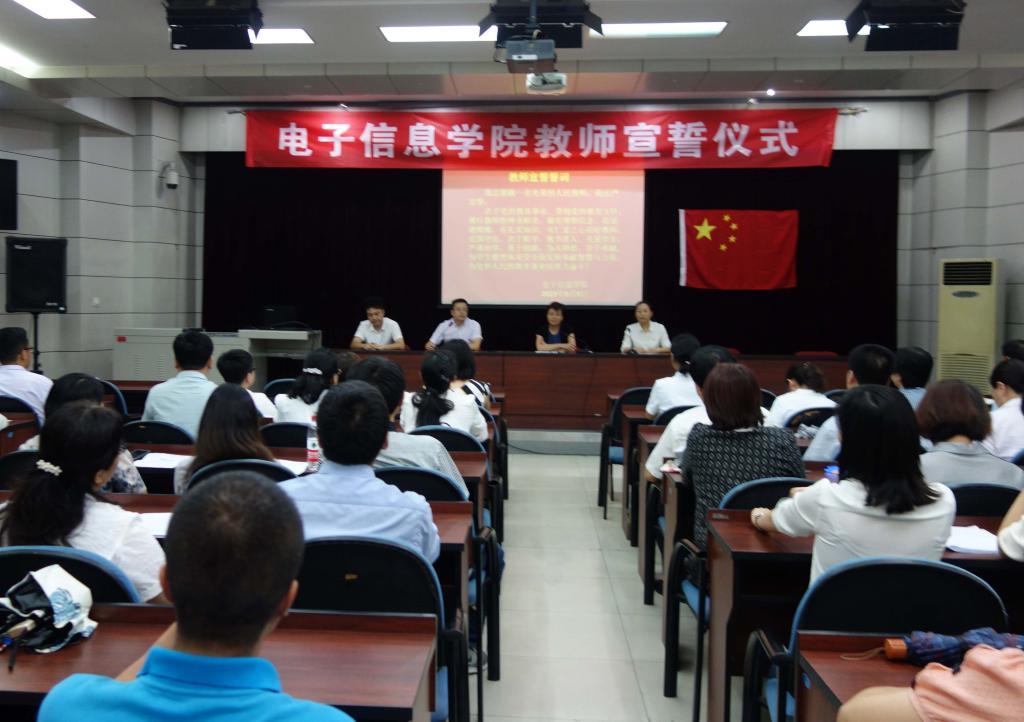 为贯彻落实陕西省教育厅《关于组织开展教师宣誓活动的通知》文件精神,提高教师的师德师风建设。9月9日下午,电子信息学院在自强校区大电教举行全体教师宣誓仪式。仪式由党总支书记张伟敏主持。