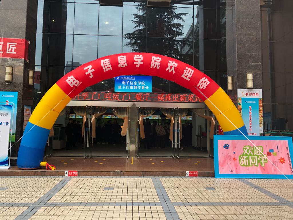 为新生顺利完成报到注册,沿途还放置了报到指示牌,每个环节均有志愿者热情引导,悉心服务,帮助新生能够准确到资格审查处、注册报到处、收费处、绿色通道及物品发放处。电子信息学院还制作了图文并茂的宣传展板,专业特色介绍、优秀教师展示等。