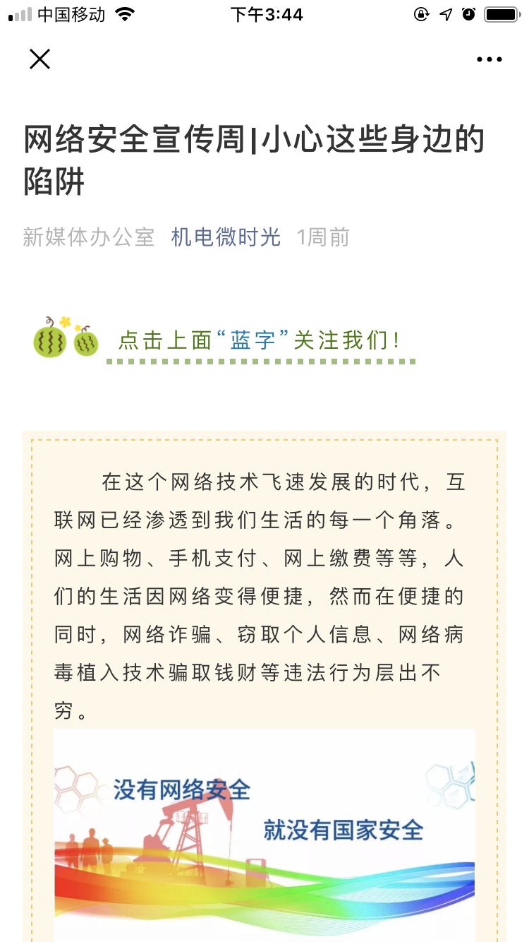 机电工程学院团总支通过以“小心身边的陷阱”为题的展板、微信平台等开展了宣传活动。同学们表示,通过大力度的组织宣传,自身的网络安全意识明显提升,对网络安全知识的了解也更加深入。