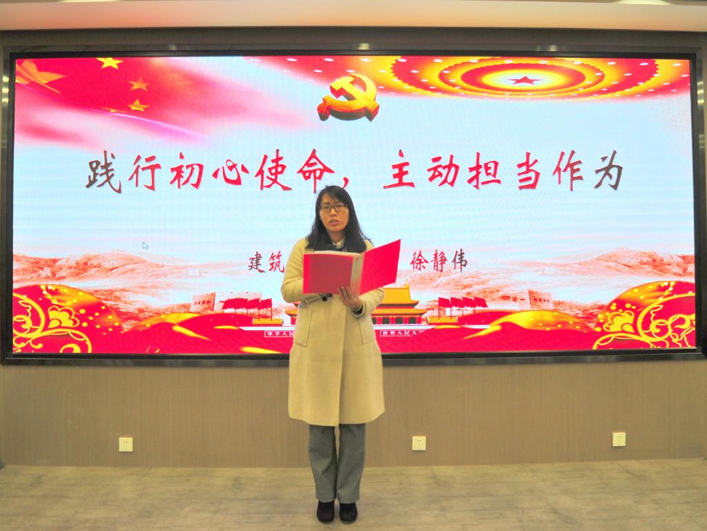 建筑工程党支部书记徐静伟以“践行初心使命,主动担当作为”为题,向大家讲述了自己在荣获全国建筑工程识图二等奖的艰辛历程中,如何克服无参赛经验、无学习资料、无参赛软件及家庭重担的感人故事。