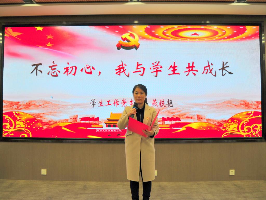 学生工作党支部党员燕铁艳以“不忘初心,我与学生共成长”为主题,围绕辅导员工作和备战陕西省辅导员大赛历程,讲述了自己如何引导青年学子扣好人生的第一粒扣子。
