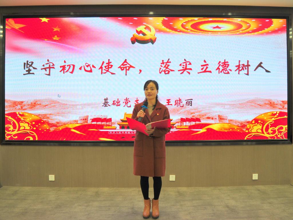 基础党支部党员王晓丽做了题为“坚守初心使命,落实立德树人”的发言,她讲述了自己如何“把思政课从有意义变成有意思”的奋斗历程。