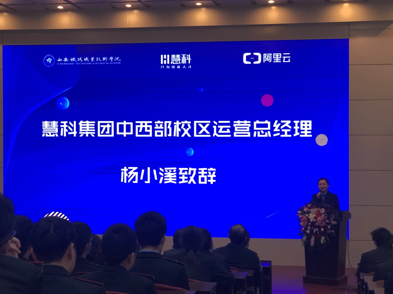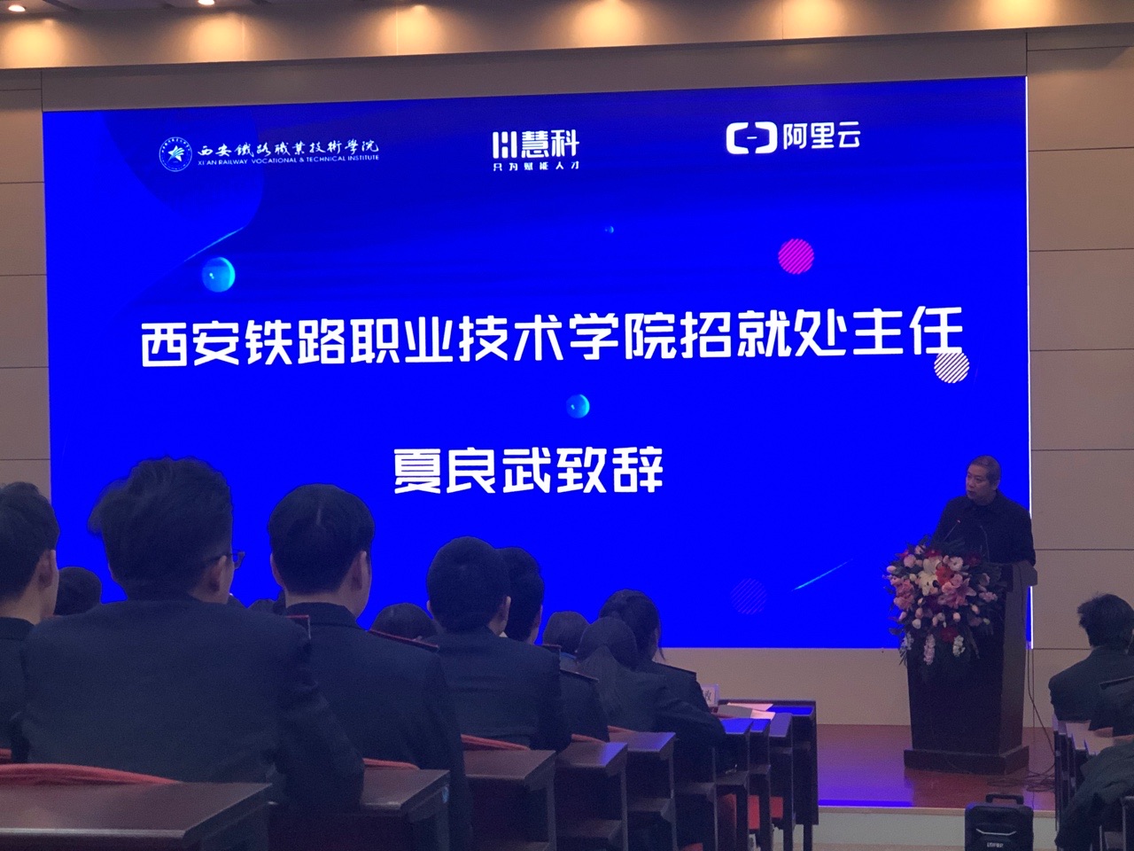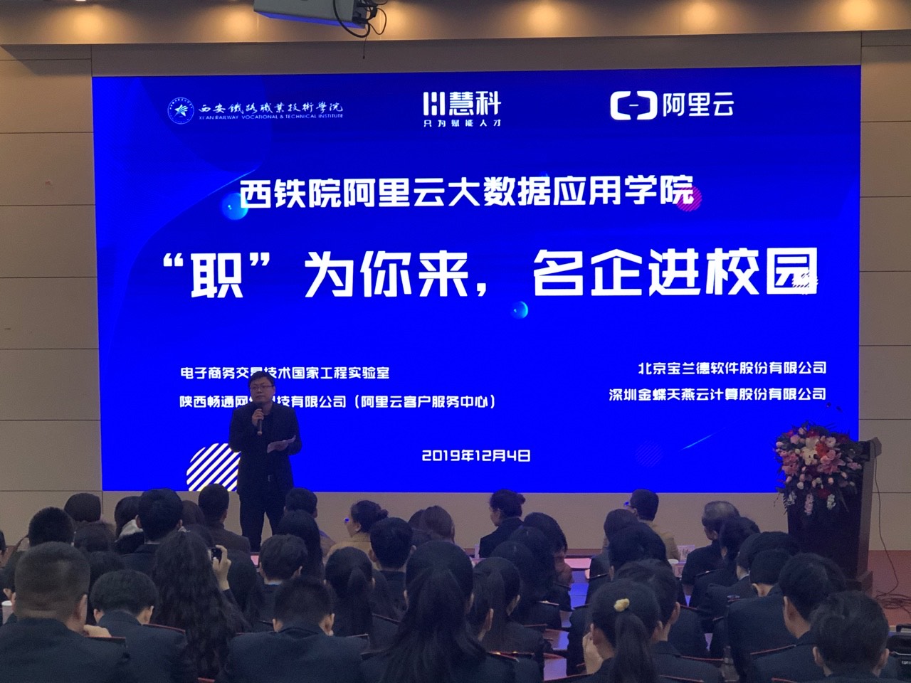 鸭脖阿里云大数据应用学院“职业起航”活动月于12月4日正式拉开帷幕,当日下午在鸭脖自强校区举行首场主题为“‘职’为你来,名企进校园”的活动。企业嘉宾,慧科教育集团代表,学院招生就业处处长夏良武、电子信息学院院长孙津平、电子信息学院党总支书记张伟敏、教师代表及大数据学院全体学生共同参与本次活动。活动由软件技术教研室主任朱金坛主持。