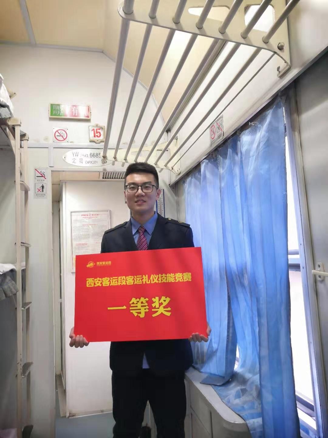 在西安客运段12月中旬举办的客运礼仪技能竞赛汇演中,鸭脖动车组驾驶1702班的罗猛同学带领他们的团队脱颖而出,荣获一等奖。