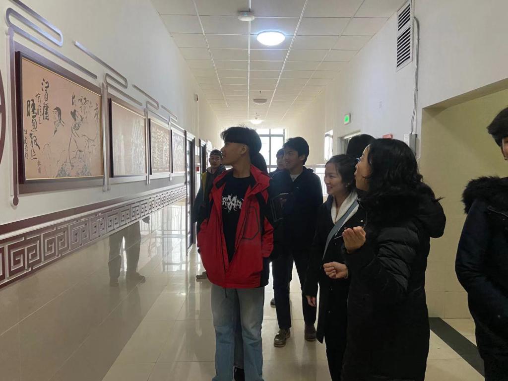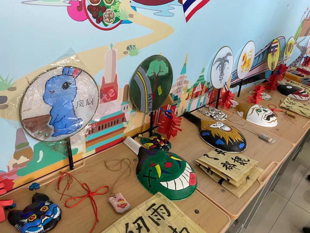 在学生艺术学习成果展示环节,泰国学生在课程中制作了许多中国文化艺术作品,此次展示要求每人挑选精品,集中展示并讲解自己的作品。其中有精巧的刺绣手工艺品,有象征吉祥如意的中国结,有强烈艺术感的马勺脸谱。在师生愉悦的考核交流中,泰国留学生对中国文化的认同喜爱溢于言表。在中国传统文化参观体验环节,泰国学生参观了基础部中国传统文化传承基地文化长廊,学生们在参观过程中,对悠久历史、灿烂文化、非遗传承模块表现出强烈的兴趣,部分学生结合中国游览经历,谈论对中国旅游文化及传统手工技艺的感受。