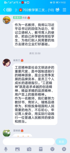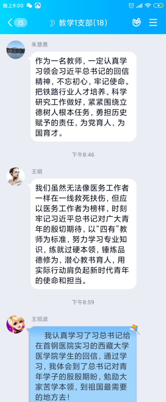教学第一、第二、第三党支部及综合党支部通过线上党员大会(扩大)组织支部所属全体教师通过QQ群、微信群、“学习强国”APP、腾讯视频会议等方式开展线上学习交流讨论活动。学生工作党支部通过支部微信群开展线上党员大会,对习近平总书记的回信原文进行学习,并组织开展了研讨交流;同时还组织安排全体学生以班级为单位通过线上主题班会等方式开展学习讨论活动。