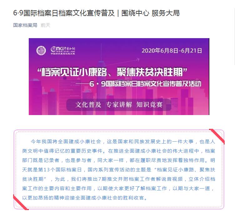 通过线上宣传活动,以文字、照片、视频的方式展示了档案工作在脱贫攻坚中的独特作用与贡献,让鸭脖师生认识档案价值、感受档案魅力,了解档案在服务社会、服务民生中的积极作用。