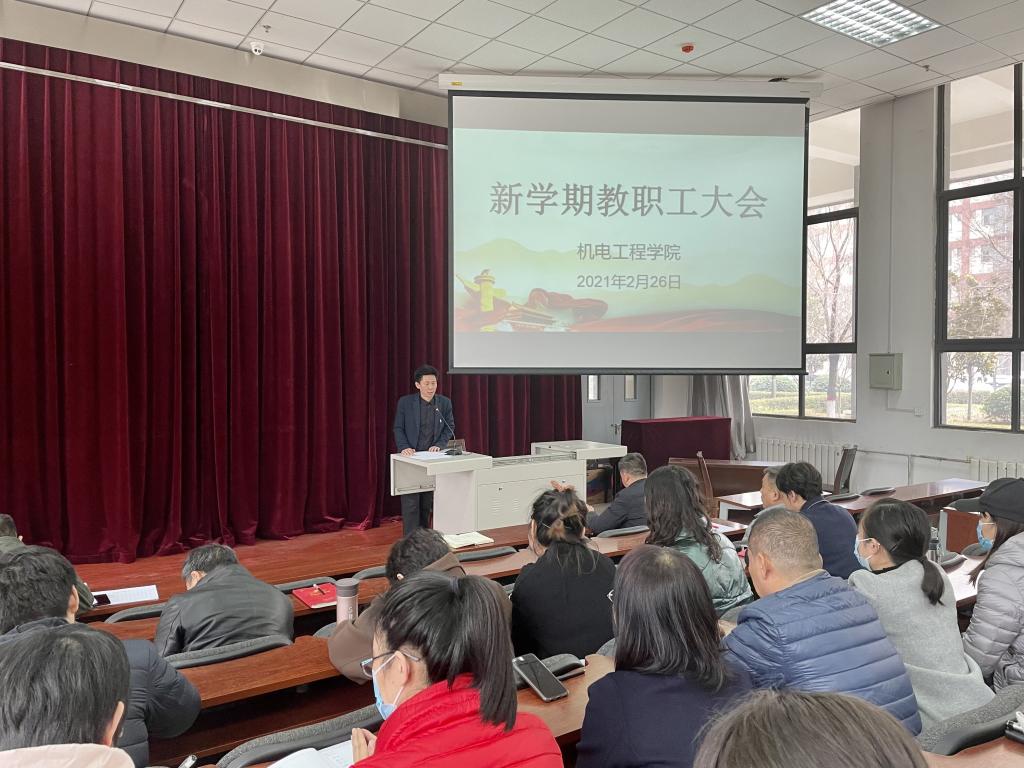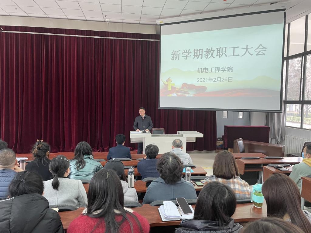 为进一步明确新学期各项工作任务和要求,保证“十四五”开好局,向建党100周年献礼,2月26日,机电工程学院在一楼阶梯教室召开了新学期第一次全体教职工大会。院长代礼前、党总支书记仵崇智在会上部署了重点任务,明确了工作要求。