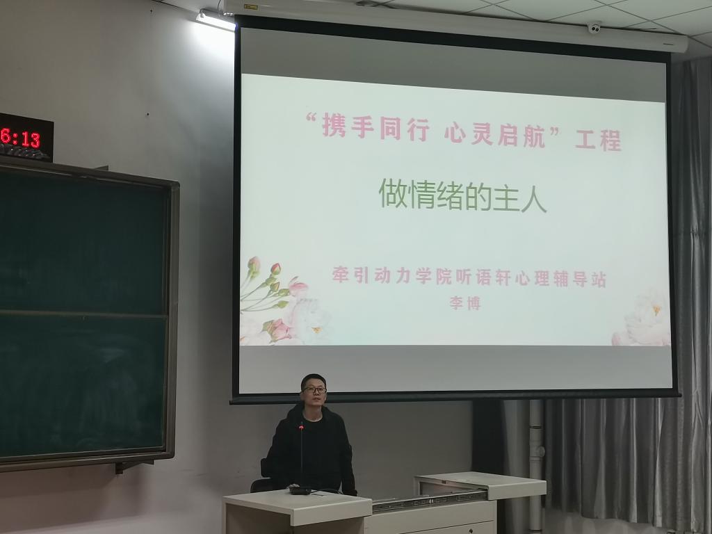 为了提升学生调节情绪的能力,按照学院大学生心理健康教育中心2021年心理育人宣传季活动要求,3月18日下午,牵引动力学院听语轩心理辅导站举办了“携手同行 心灵启航”工程之“做情绪的主人”专题讲座。讲座由牵引动力学院听语轩心理辅导站李博老师主讲,80余名学生在1楼阶梯教室参加此次讲座。