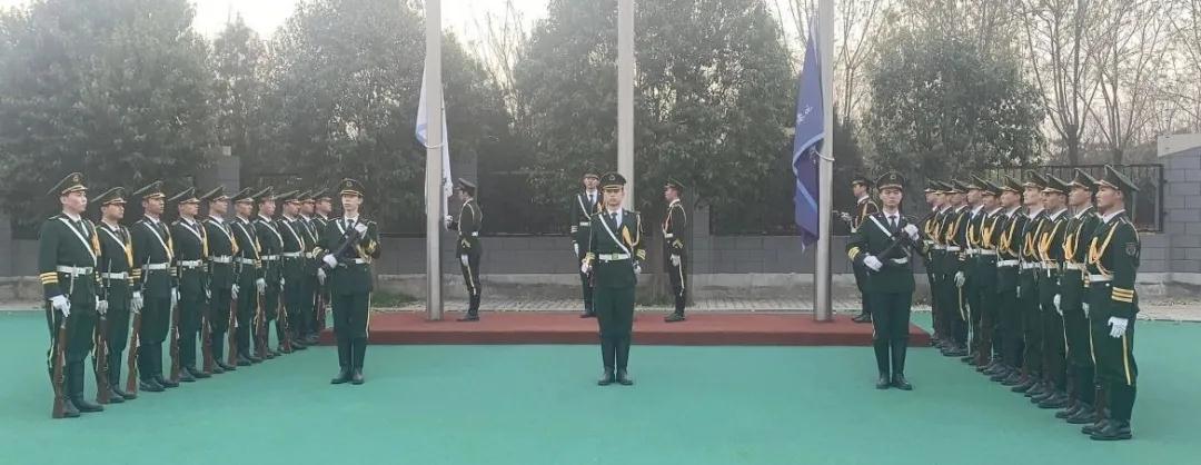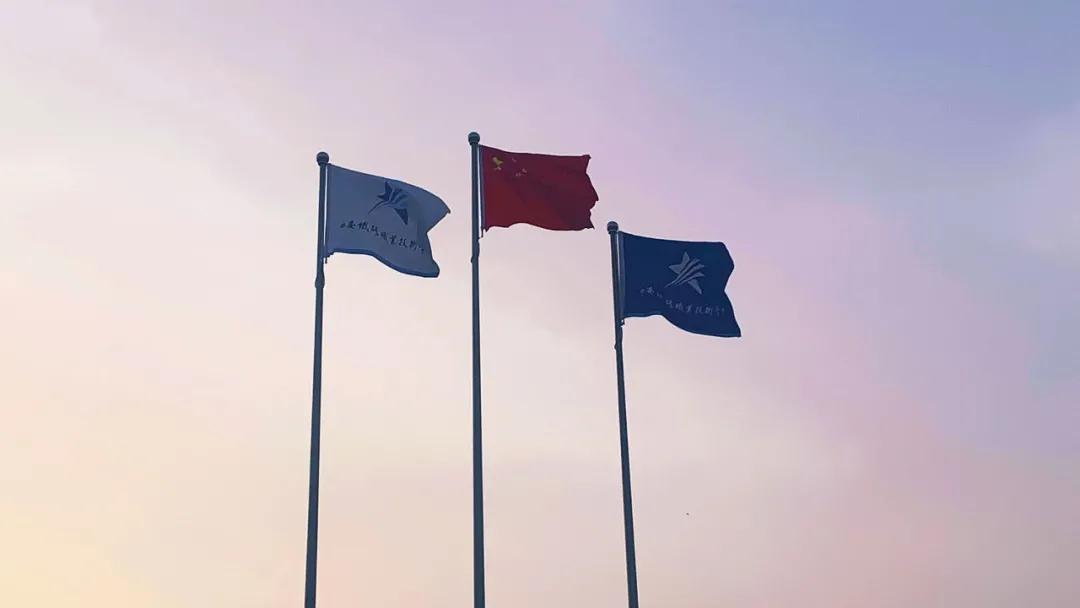 升国旗,院旗。庄严的国歌声奏起,全体人员肃立,行注目礼,鲜艳的五星红旗冉冉升起,随风飘扬。