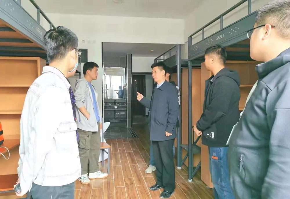 在详细听取介绍后,一行人参观了基地基础设施、预录11名学生实习期的工作和生活环境。仵崇智书记详细询问了解了预录学生的薪资待遇,就餐,住宿,工作时长等具体问题,随后来到了实习生宿舍。仵书记同学生们亲切交谈,鼓励大家把握实习机会,认真学习了解企业文化,增强自身技能,发扬刻苦钻研,吃苦耐劳精神,在岗位上发光发热。又叮嘱同学们要注意安全,照顾好自己的身体,如遇到问题要及时与学校联系。