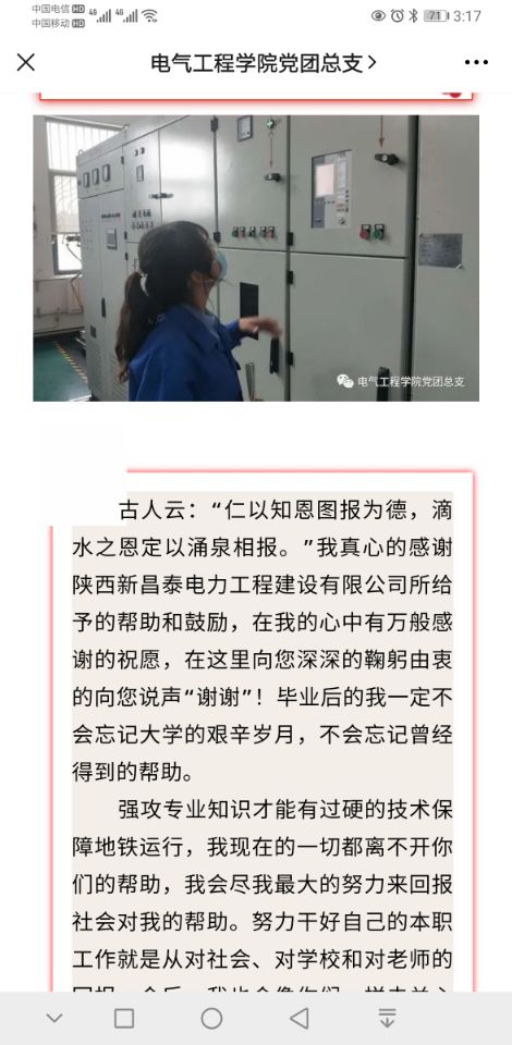 陕西昌泰电气科技发展有限公司是一家专业从事输变电工程、电力设备安装、照明通风自动化设备工程设计和施工的专业公司。公司在自身发展的同时,积极参与公益活动,履行社会责任,2017年开始,在鸭脖设立了首个企业冠名的奖学金——“陕西新昌泰电力奖学金”,每年为电气工程学院品学兼优的贫困生提供5万元奖(助)学金,支持电气工程学院职业教育事业发展。三年来,已先后有81名电气学子获得了该项奖(助)学金,受到奖助学金的学生常怀感激之心,在感谢信中表示:一定不辜负贵公司的浓浓真情和爱心,将更加努力地学习和工作,以优异的成绩回报社会。