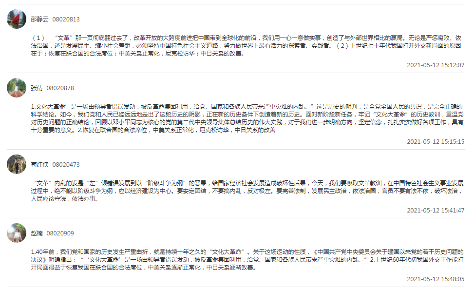 随后,全体党员在云班课上就““文化大革命”爆发的原因、经过”和“教训与上世纪70年代初我国对外工作能够打开新局面的原因”两个问题展开了讨论。