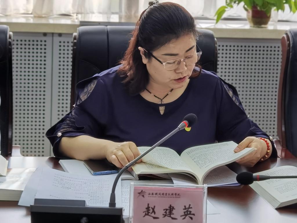 会上,赵建英首先带领大家学习了学院《关于开展党史学习教育第四次集中学习的通知》,明确了本次学习的内容和要求。随后领学了习近平总书记对职业教育工作的重要指示、李克强总理批示精神以及习近平总书记在清华大学考察时重要讲话精神。