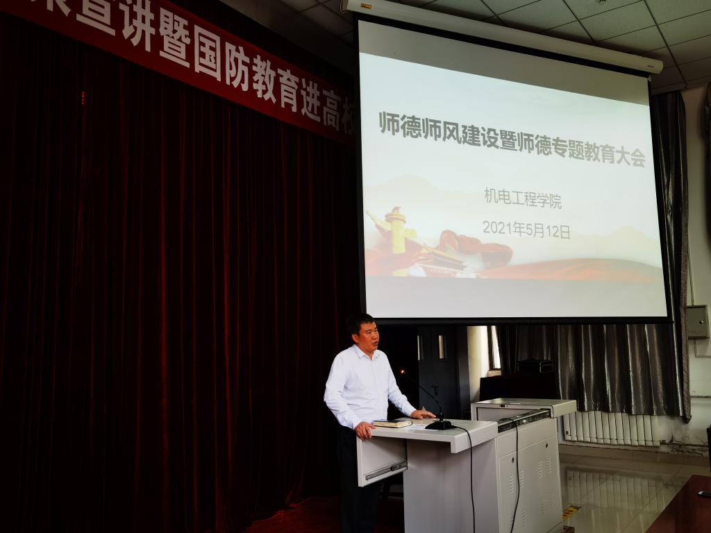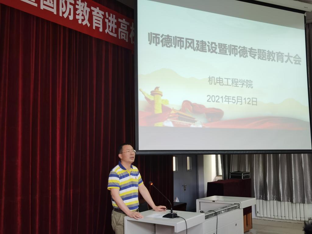 为加强鸭脖师德师风建设,坚决落实教师职业行为十项准则要求,进一步强化思想政治素质和职业道德观念,5月12日下午,机电工程学院在一楼阶梯教室召开了师德师风建设暨师德专题教育大会。会议由办公室主任邵泽宽主持。