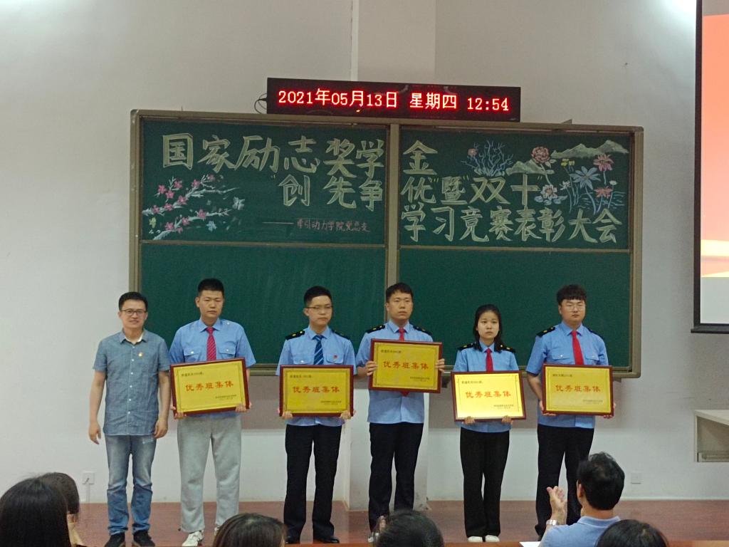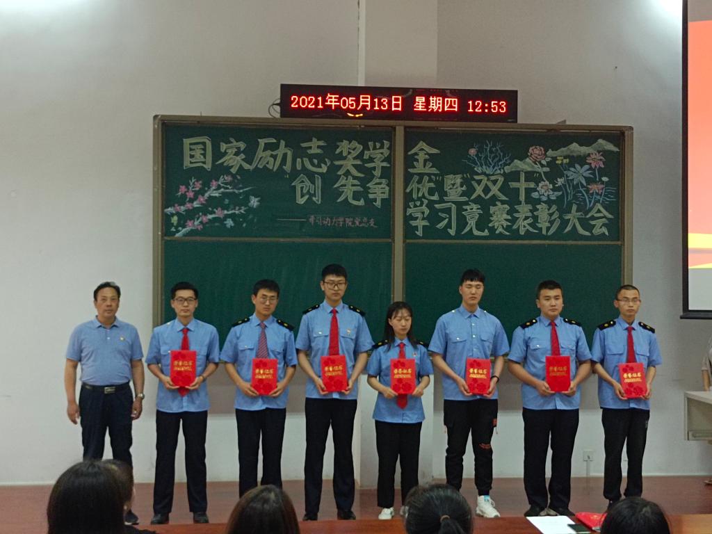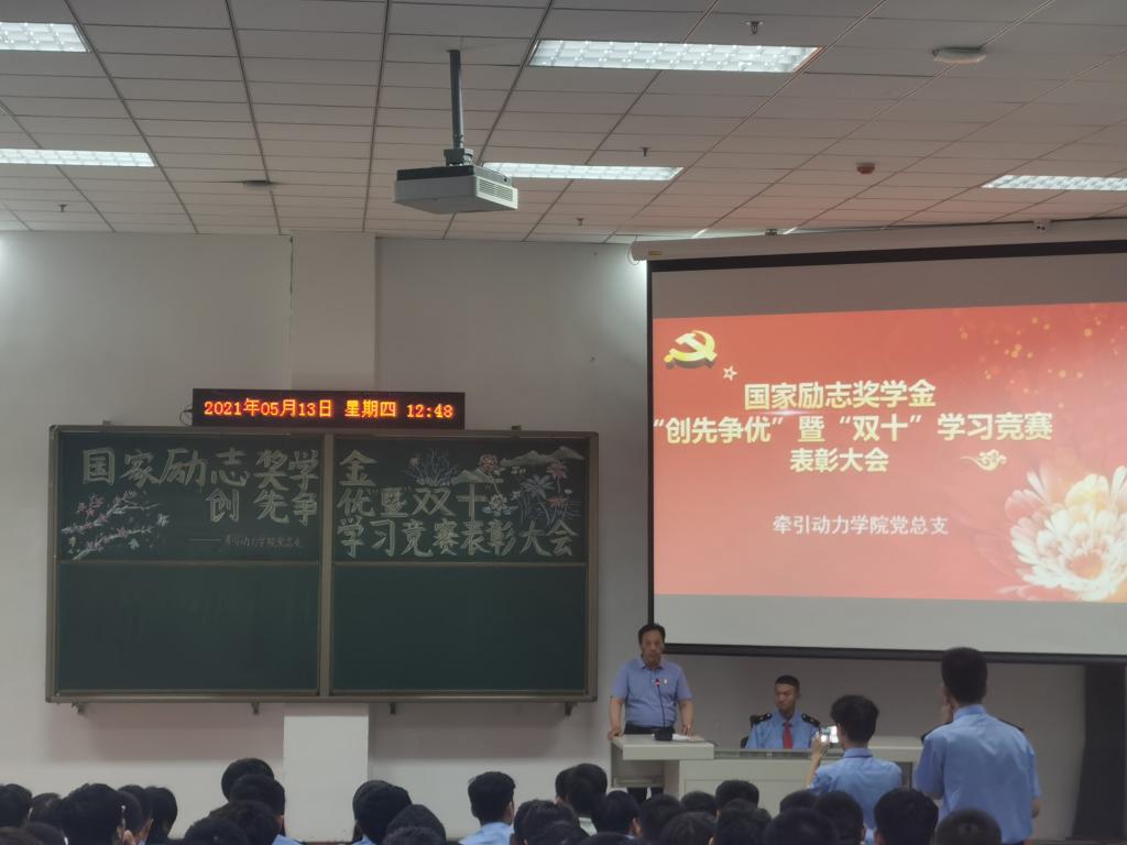 5月13日中午,牵引动力学院党总支在学院一楼阶梯教室举行国家励志奖学金获得者、创先争优暨“双十”学习竞赛表彰大会。牵引动力学院党总支书记李贞伟、学工办主任陈广勇、组织委员王燕萍以及辅导员、班主任代表和学生代表200余人参加了会议,会议由辅导员杨若主持。