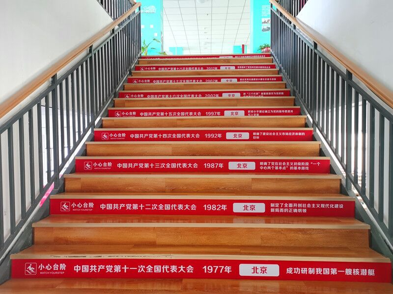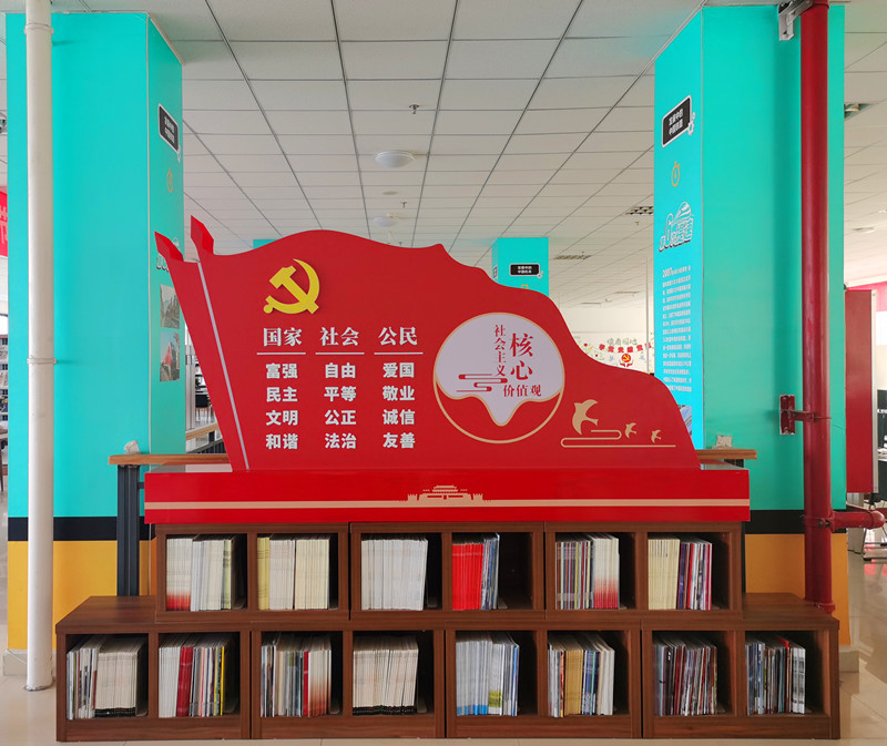 结合党史学习教育,在通往二楼的阶梯上用醒目的红底将中国共产党一大至十九大召开的时间、地点、历史意义标示出来,充分将党史教育贯穿在图书馆文化育人的细微之处。通过精心设计,新增了社会主义核心价值观标识牌、文化墙,同时布置了党史学习教育园地。阅览环境的改变,赋予了图书馆更加浓郁的红色书香气息。