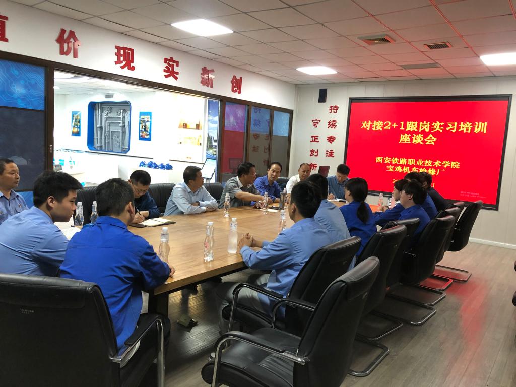 5月21日,宝鸡机车检修厂厂长徐喻乐、职教科长雷鑫、牵引动力学院院长李益民、副院长林辉、铁道机车教研室主任张省伟、铁道机车车辆制造与维护专业带头人刘宏利、高级实验师薛振洲和10名在宝鸡机车检修厂跟岗实习的学生进行对接国铁2+1培训质量跟踪座谈会,并征求了学生对课程设置与内容以及“2+1”校企联合培养的意见。深入调研了学生跟岗实习过程中生活、工作、学习等方面的情况,通报了本次中国铁路西安局集团有限公司机车电工、机车钳工等工种鉴定情况,针对机车电工和机车钳工技能鉴定结果逐人询问应对方法,并做了分析对比,还与同学们分享、讨论、交流、总结了提升学习质量的方法和体会,也为今后进一步提升“2+1”校企联合培养质量提供了很好的借鉴。李益民、徐喻乐嘱咐学生在下一阶段的实习中要注意安全、注意学习方法、提升职业技能、加强合作意识培养,查缺补漏,争做优秀人才。
