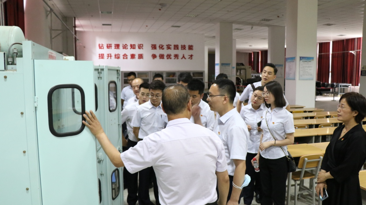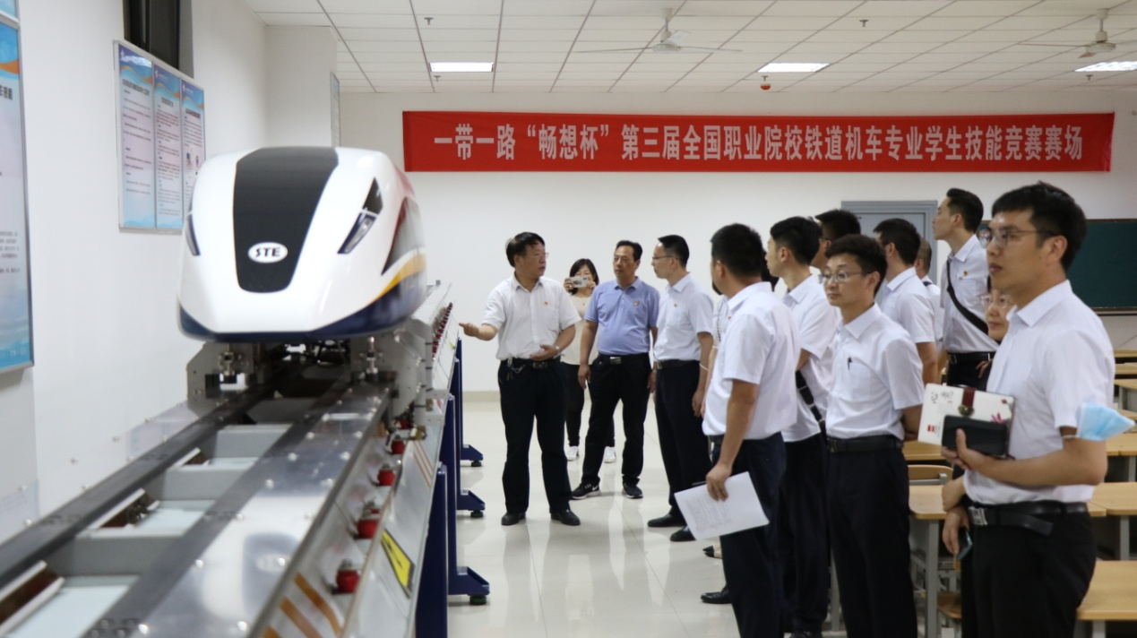 西安地铁运营分公司运营二中心调度二部技术综合党支部书记兼调度二部经理黄小林、综合管理室副主任金燕、航天城控制中心副主任贺小鹏及各专业优秀员工代表一行12人,在牵引动力学院党总支书记李贞伟、院长李益民陪同下参观了城轨车辆实训基地与铁道机车实训基地,高级实验师薛振洲、城轨车辆专业带头人马仲智及骨干教师雷晓娟就实验实训设备作了详细讲解。