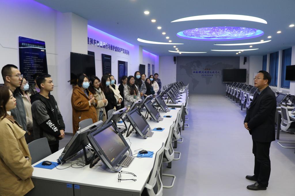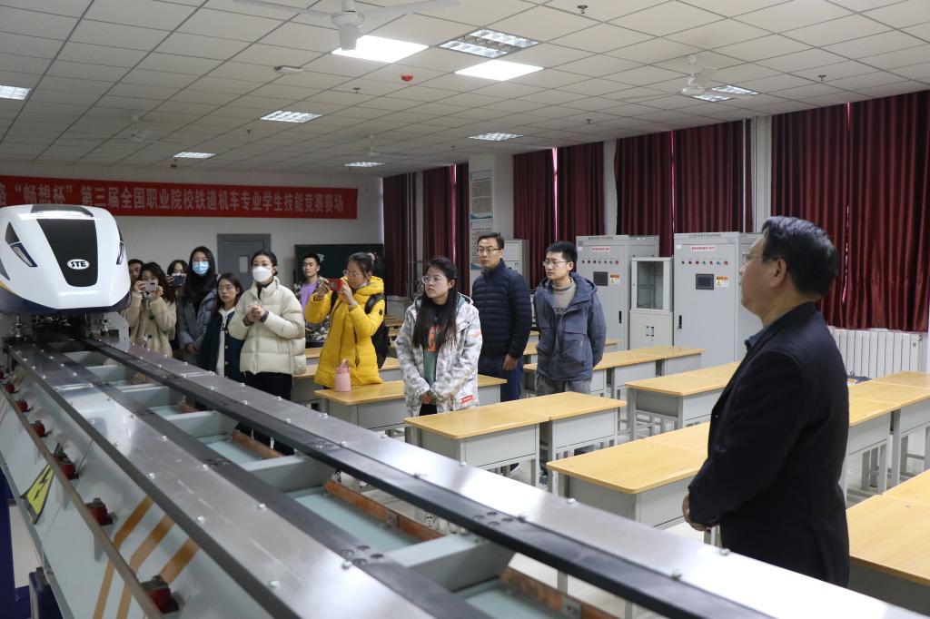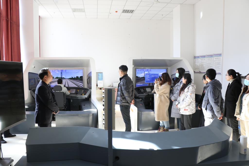 23名新教师在李益民的带领下分别参观了CR400BF型复兴号动车组模拟驾驶实训室、HXD3D型大功率交流传动电力机车整车装备实训室、转向架演练场、制动机实训演练场、磁悬浮列车实训室、HXD3C型大功率交流传动电力机车一次乘务作业实训中心、CR38080AL型动车组驾驶暨牵引传动实训中心、地铁列车模拟驾驶室、国家级轨道交通职业教育虚拟仿真基地等实验实训中心,让新加入的教师近距离感受牵引动力学院的实验实训设备和实践教学条件。