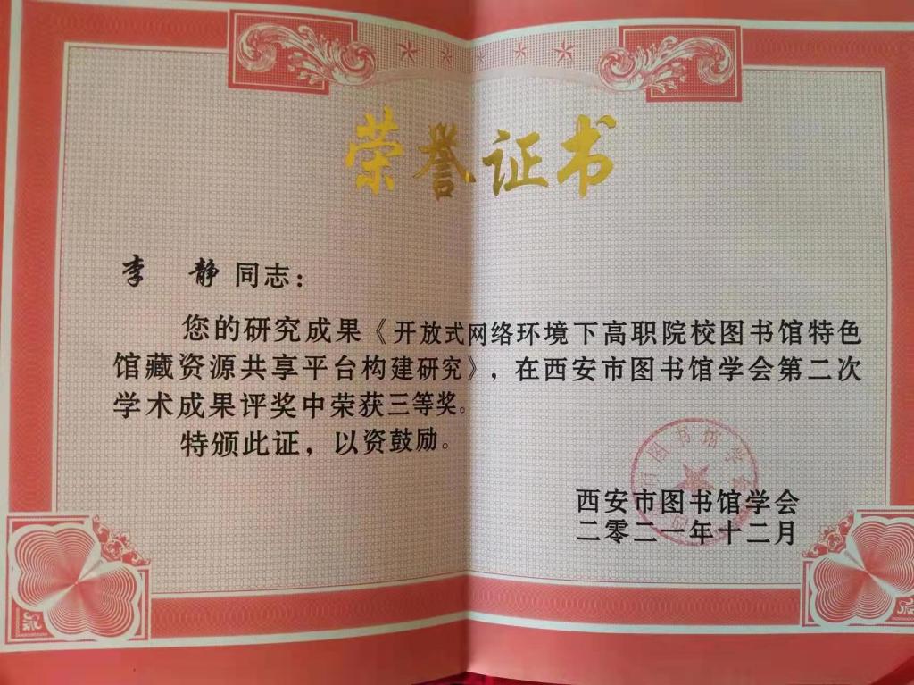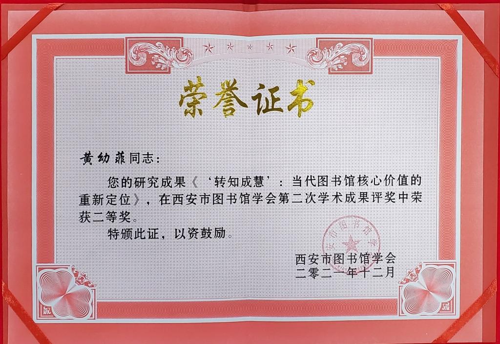 会上,鸭脖图书馆教师黄幼菲的论文《“转知成慧”:当代图书馆核心价值的重新定位》荣获西安市图书馆学会第二次学术成果评奖二等奖,教师李静的论文《开放式网络环境下高职院校图书馆特色馆藏资源共享平台构建研究》荣获三等奖。图书馆馆长袁素瑛作为西安市图书馆学会副理事长、学术研究委员会主任主持了徐建华教授的讲座。