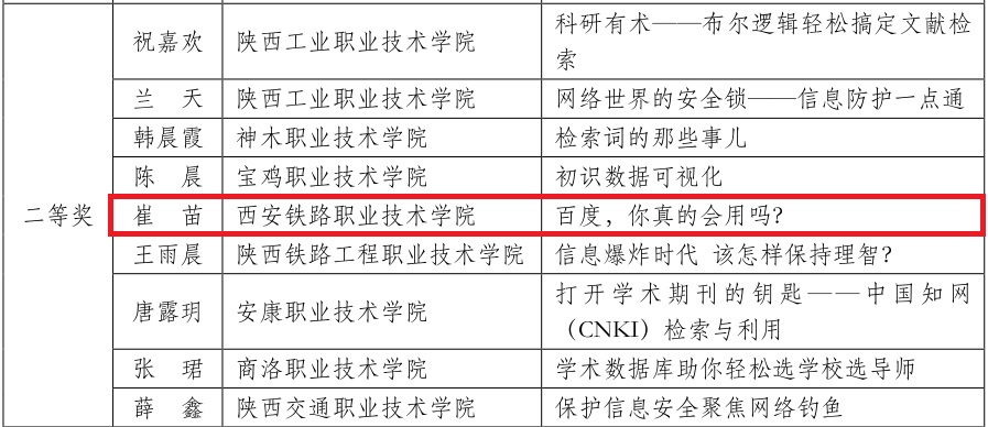 据悉,今年全省有14所高职高专院校的52件参赛作品参加了教师微课赛,24所高职院校6132人参加了学生个人赛。最终,鸭脖图书馆崔苗的参赛作品《百度,你真的会用吗?》获得教师组二等奖,郭佳美、南雯雯获得学生个人赛二、三等奖,黄幼菲、姚彤、陈晔荣获优秀指导教师,鸭脖荣获优秀组织奖,陈晔荣获先进工作者。