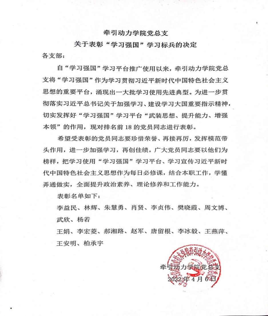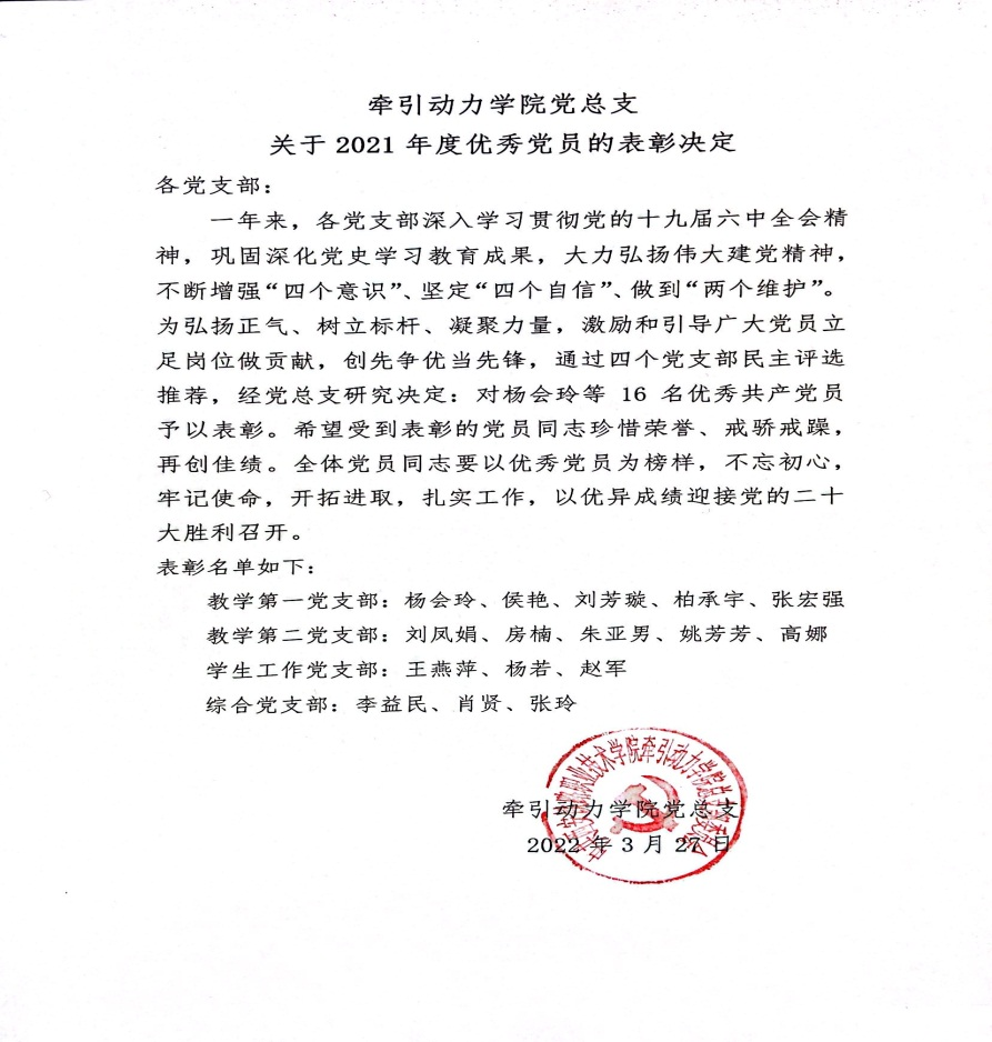 为树立标杆,表彰先进,激励和引导广大党员在新学期立足岗位做贡献,创先争优当先锋,牵引动力学院党总支近期对在去年的教学能力大赛、学生教育管理、党史学习教育、学习强国学习等各项工作中取得优异成绩的优秀党员进行了表彰奖励。