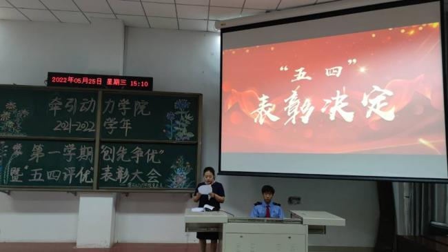 青年是国家的希望,青年是民族的未来,中国青年始终是实现中华民族伟大复兴的先锋力量,是推进中国特色社会主义伟大事业的生机所在。2022年5月25日,牵引动力学院召开“2021—2022学年第一学期‘创新争优’暨‘五四评优’表彰大会”,牵引动力学院党总支书记李贞伟、学工办主任陈广勇及相关人员参加大会。