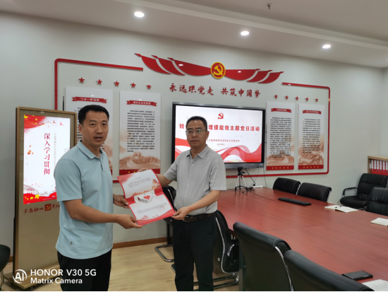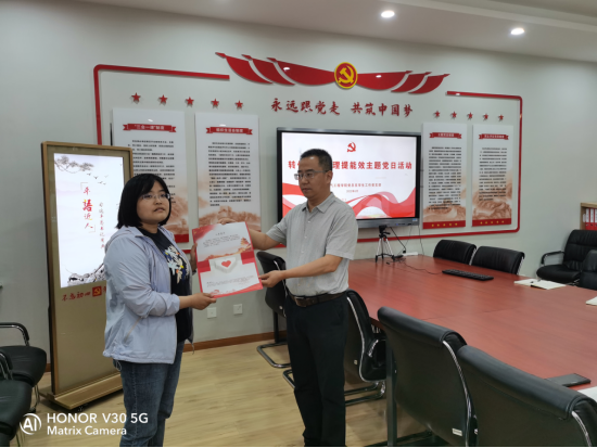 党总支副书记喻朝晖代表党总支向过“政治生日”的党员马纪、侯嵘赠送写有希望和寄语的生日贺卡,并致贺词,激发其责任感和使命感,提醒其坚定理想信念,以实际行动践行入党誓言。