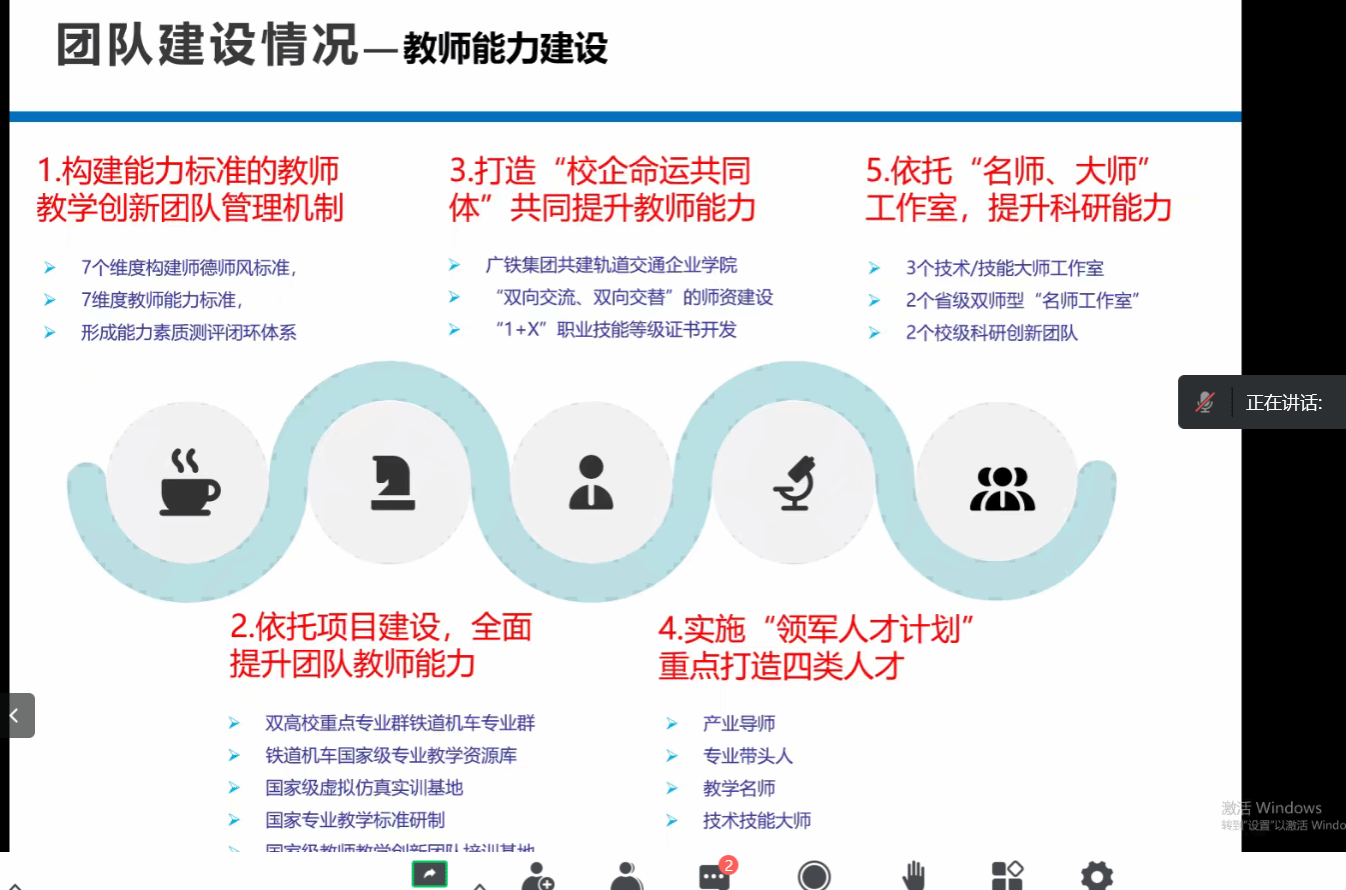 徐小勇教授从团队建设计划完成情况,团队建设工作开展情况、团队建设标准性成果及建设过程存在的问题等几方面汇报了鸭脖铁道交通运营管理专业国家级教学创新团队建设情况。