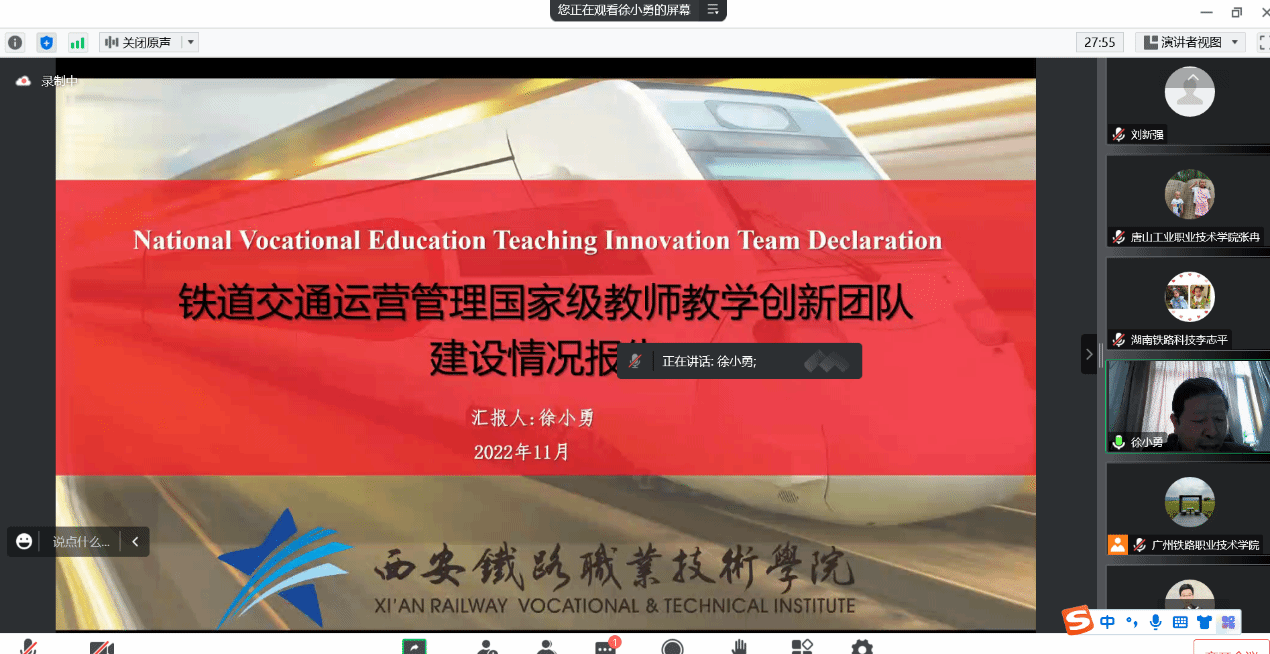 2022年11月4日,国家级教师教学创新团队协作共同体建设工作研讨会在腾讯会议召开,教育部教师教学创新团队秘书处刘东主任参加会议并讲话,交通运输学院院长徐小勇教授、刘新强教授参加会议,徐小勇教授向大会汇报了鸭脖铁道交通运营管理教师教学创新团队的建设情况。