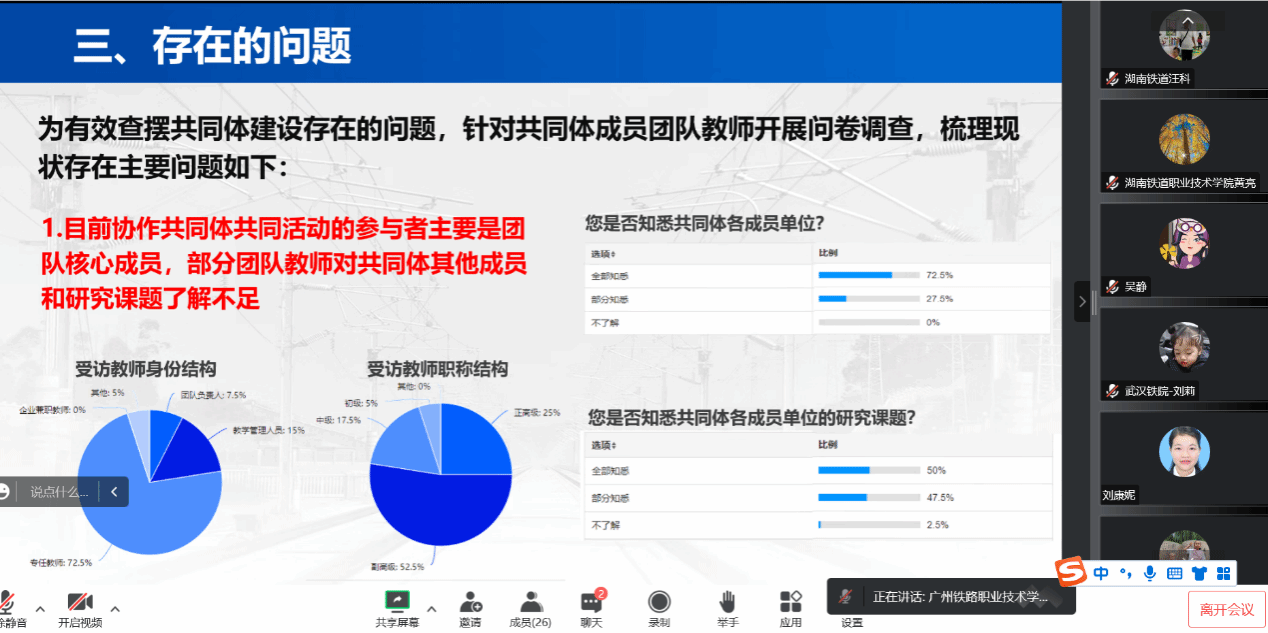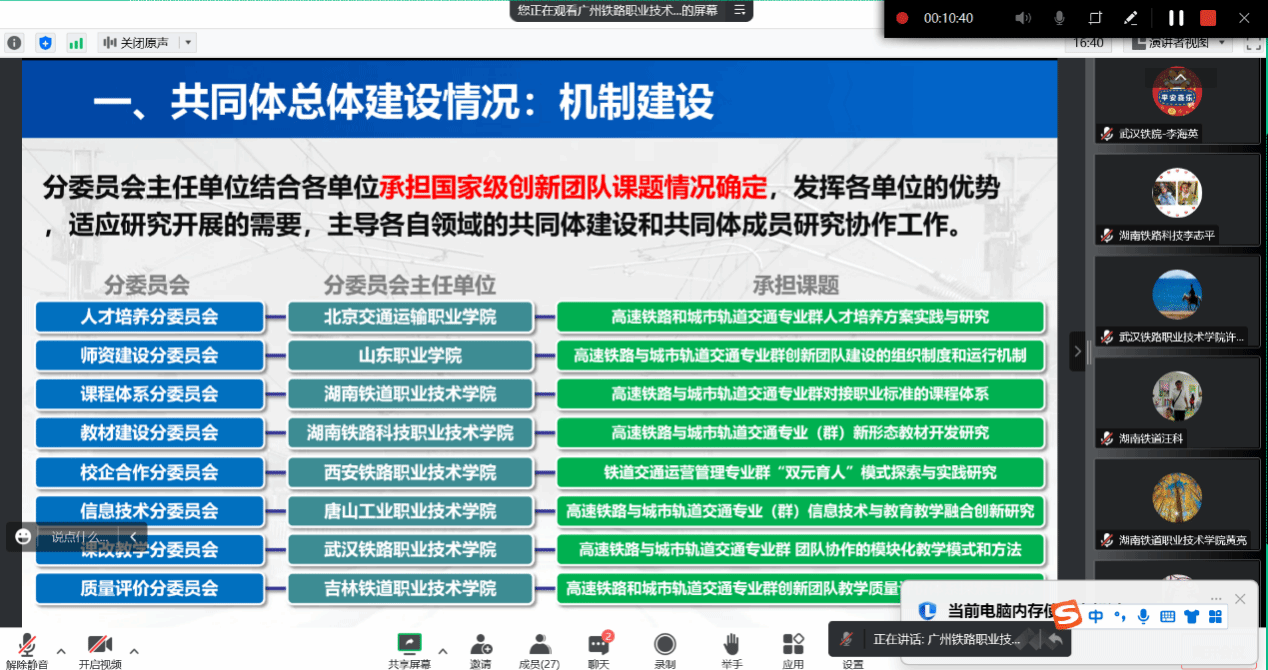 会议首先由广州铁路职业技术学院首先向大会汇报了现代交通运输(三)协作共同体9个分委员会的工作机制,各成员学校分别汇报了各国家级教师教学创新团队的建设成果、工作开展情况、存在问题和主要成效。