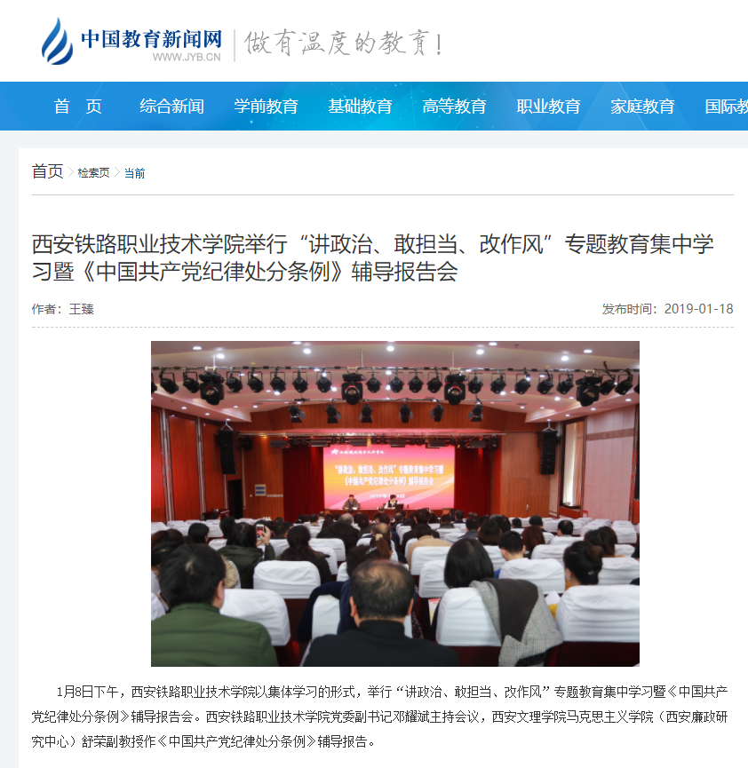 中国教育新闻网:yabo鸭脖官网举行“讲政治、敢担当、改作风”专题教育集中学习暨《中国共产党纪律处分条例》辅导报告会