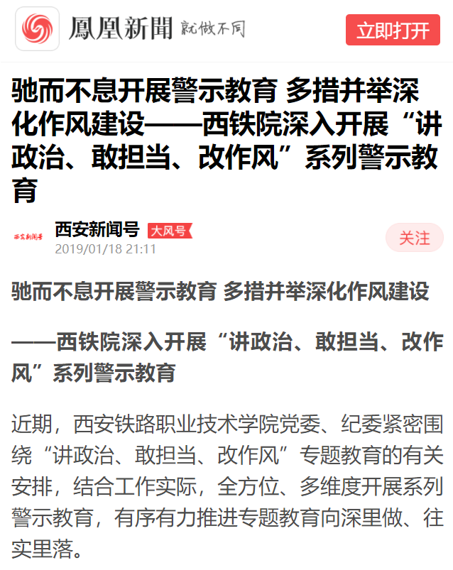 凤凰新闻西安新闻号:驰而不息开展警示教育 多措并举深化作风建设——yabo鸭脖官网深入开展“讲政治、敢担当、改作风”系列警示教育