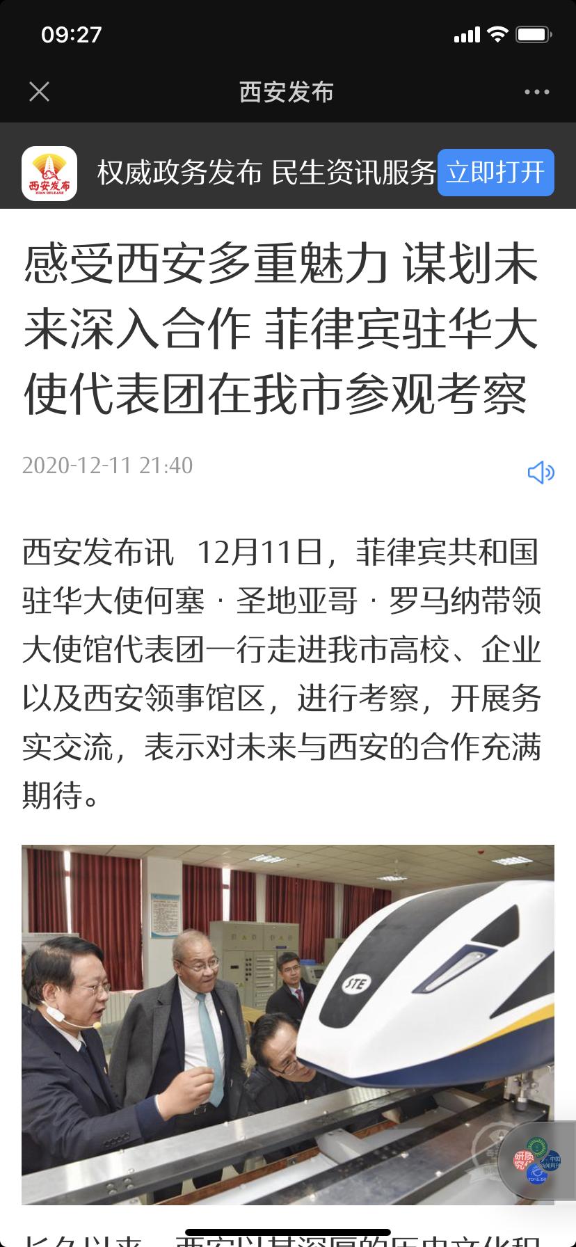 西安发布:感受西安多重魅力 谋划未来深入合作 菲律宾驻华大使代表团在我市参观考察